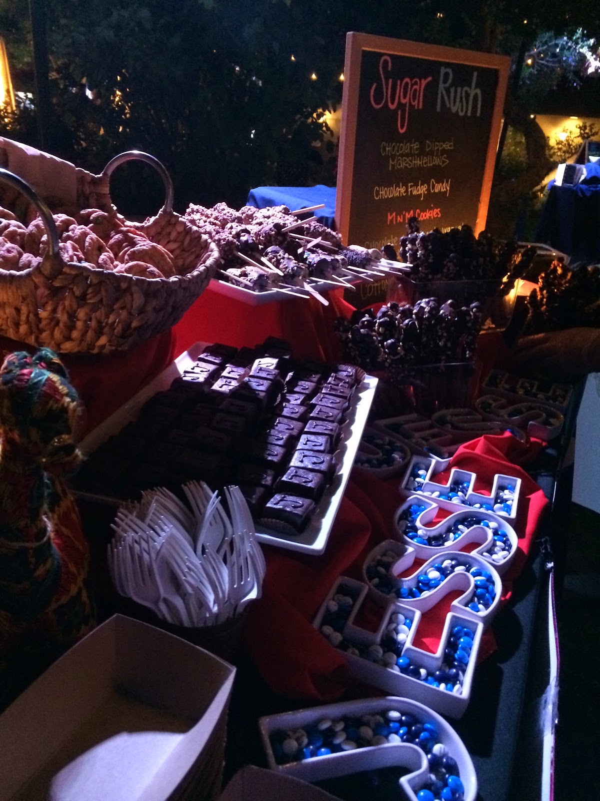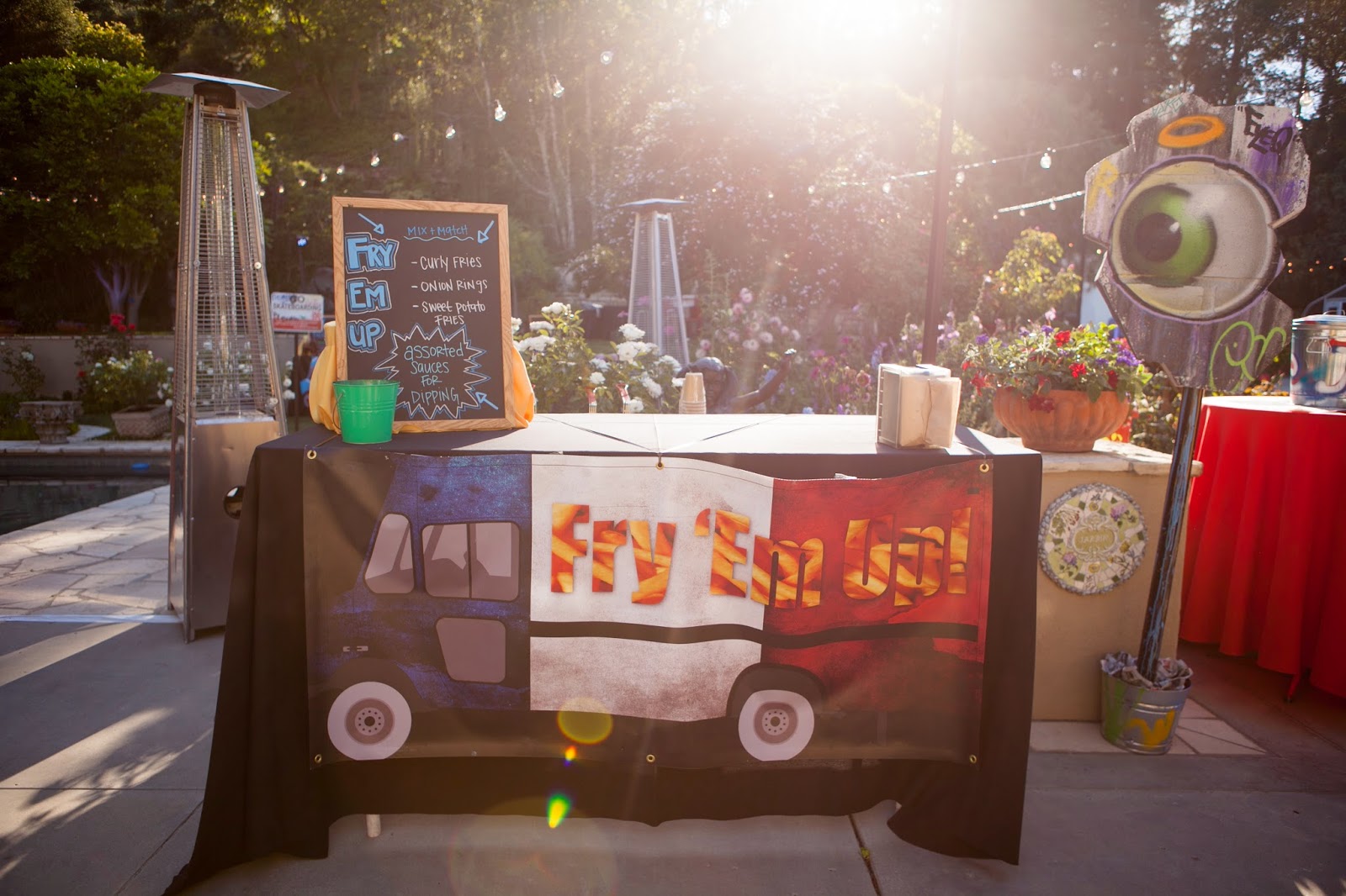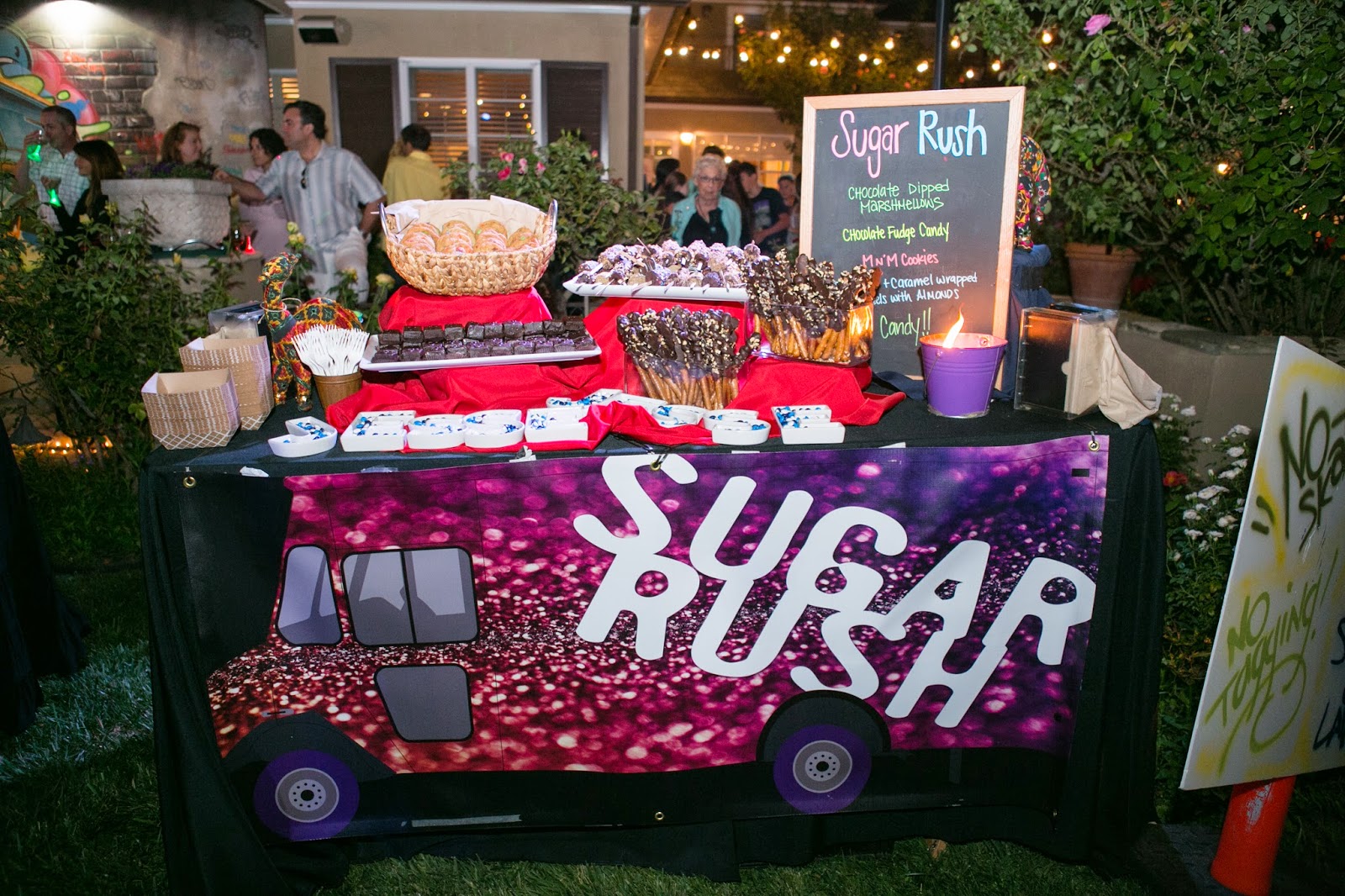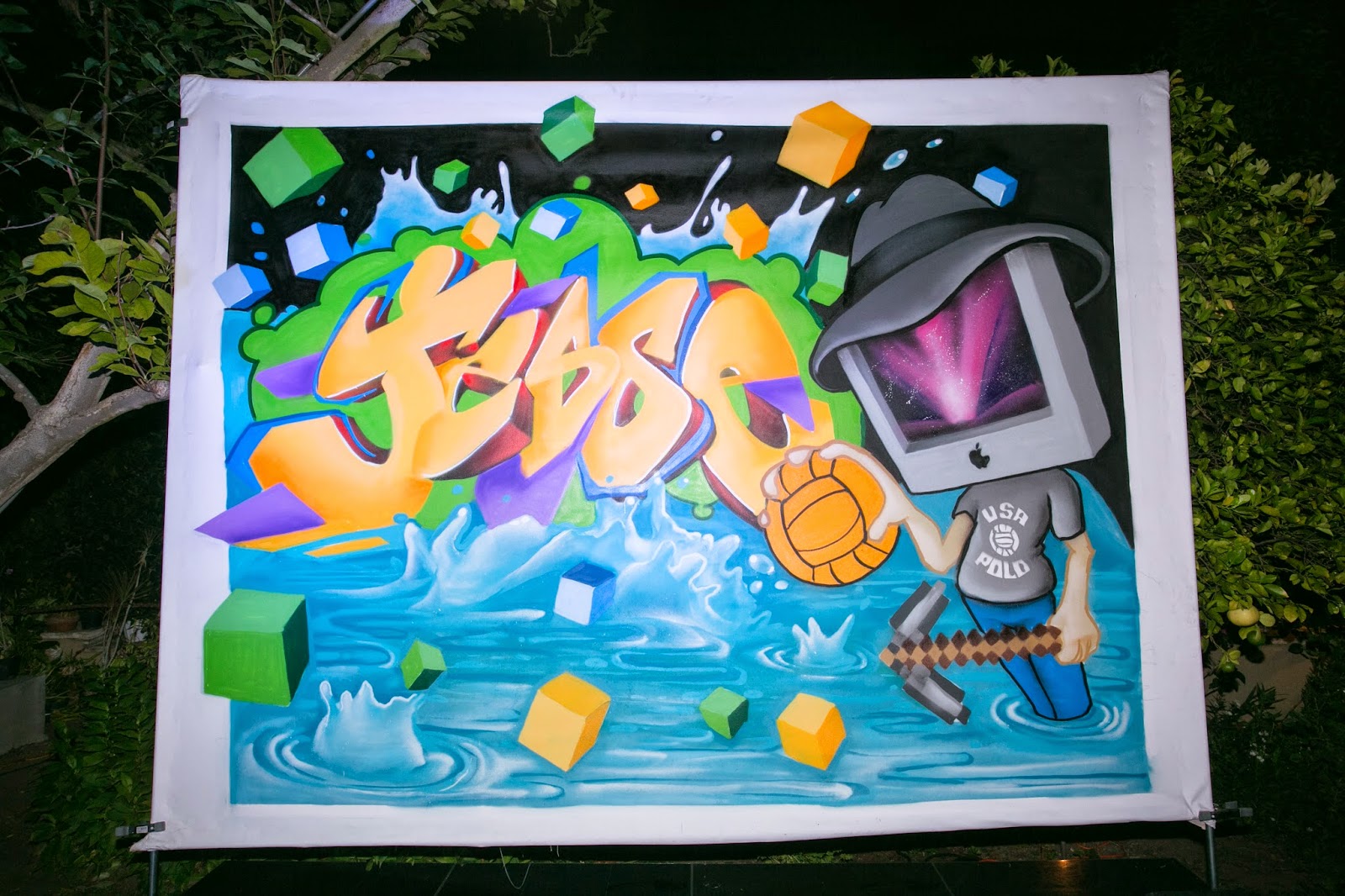 You would have been hard pressed to find an inch of this event that didn't have one street themed item on it. The various food stations were made to look like food trucks. Guests got to have custom tagged hats, license plates, and towels to take home with them. The party was decorated with tagged street signs, chain link fence, cones, and caution tape. Best of all, there were huge graffiti wall installations around the event space. The entry way had a custom made arch with Jesse's name on it. There was a "Jesse" graffiti wall in the party for guests to take photos in front of. And during the party there was a "live" graffiti artist making a custom made piece while guests watched the masterpiece unfold.