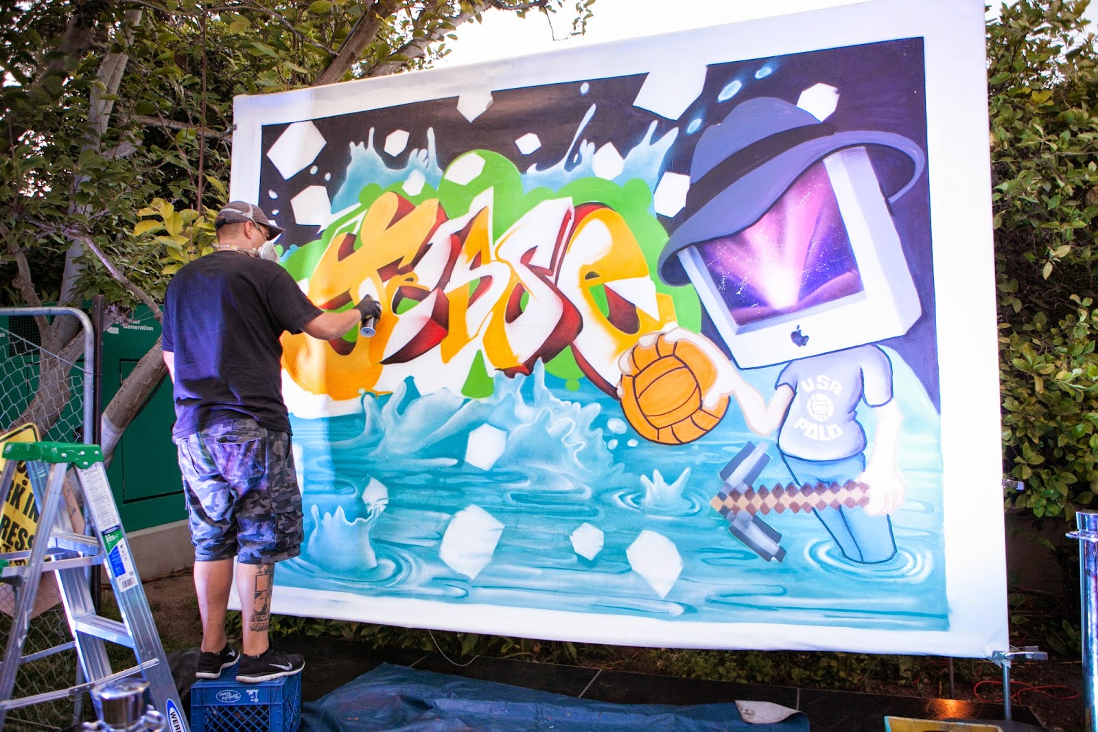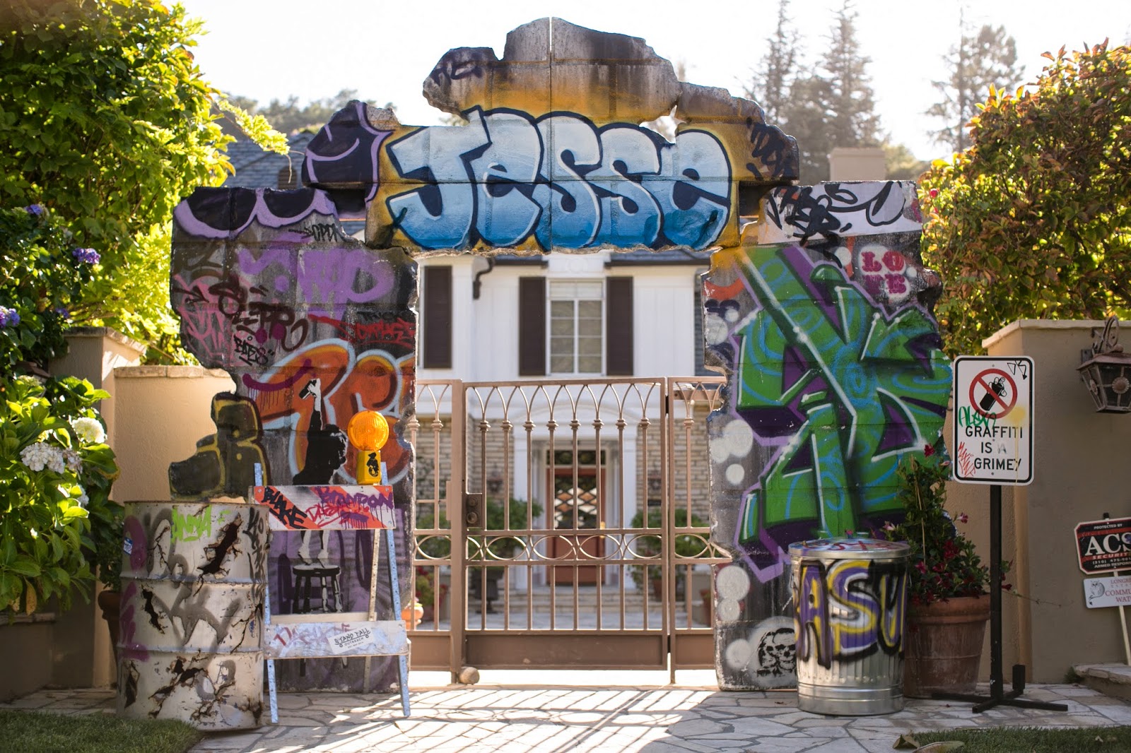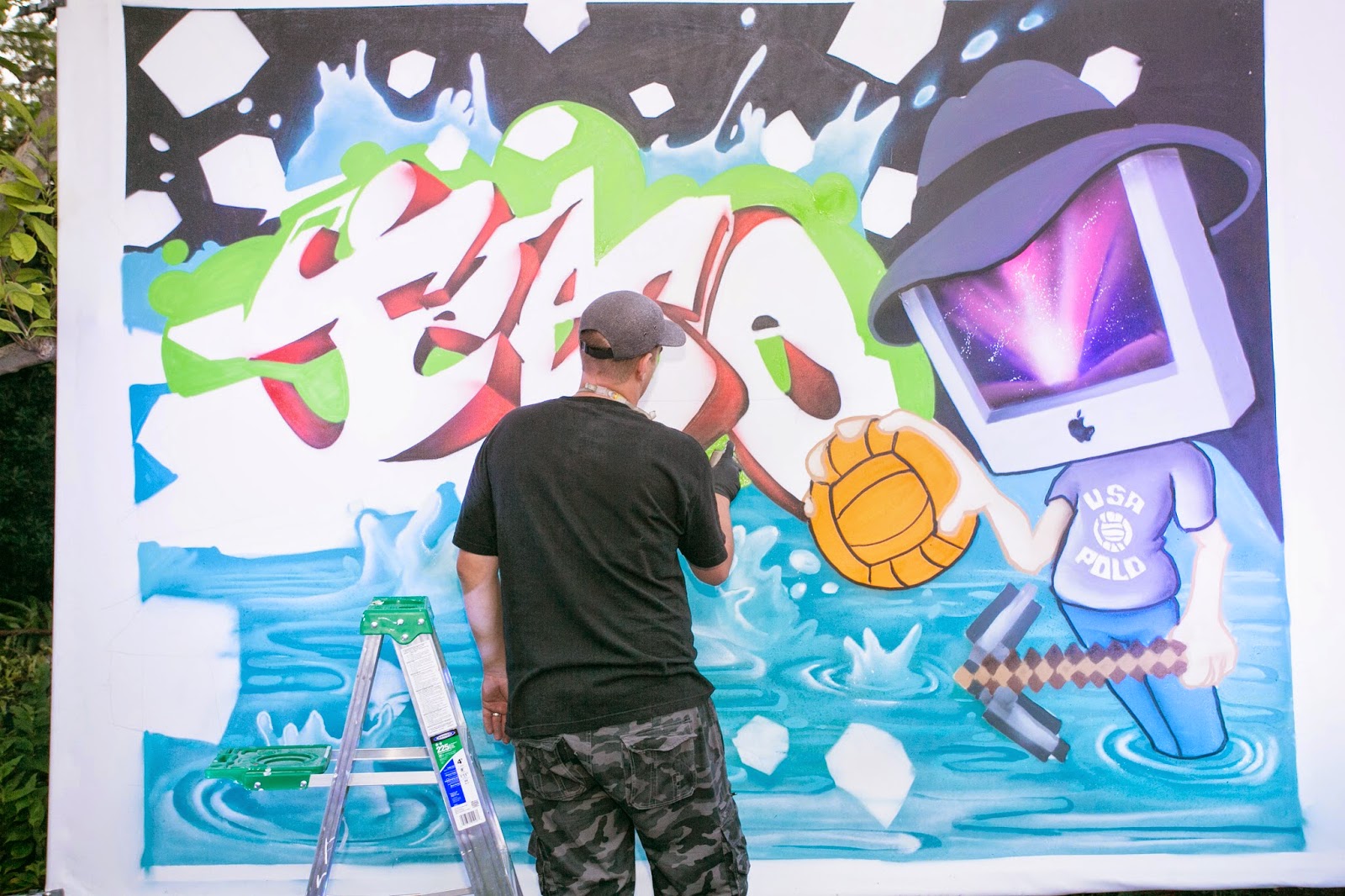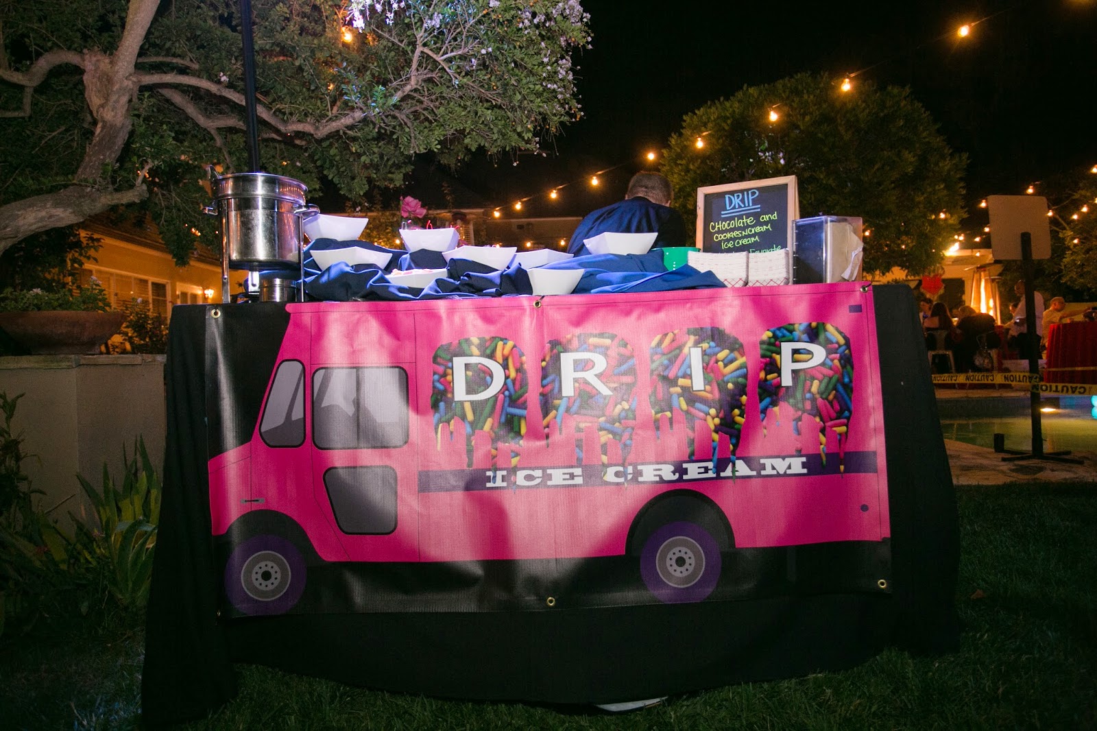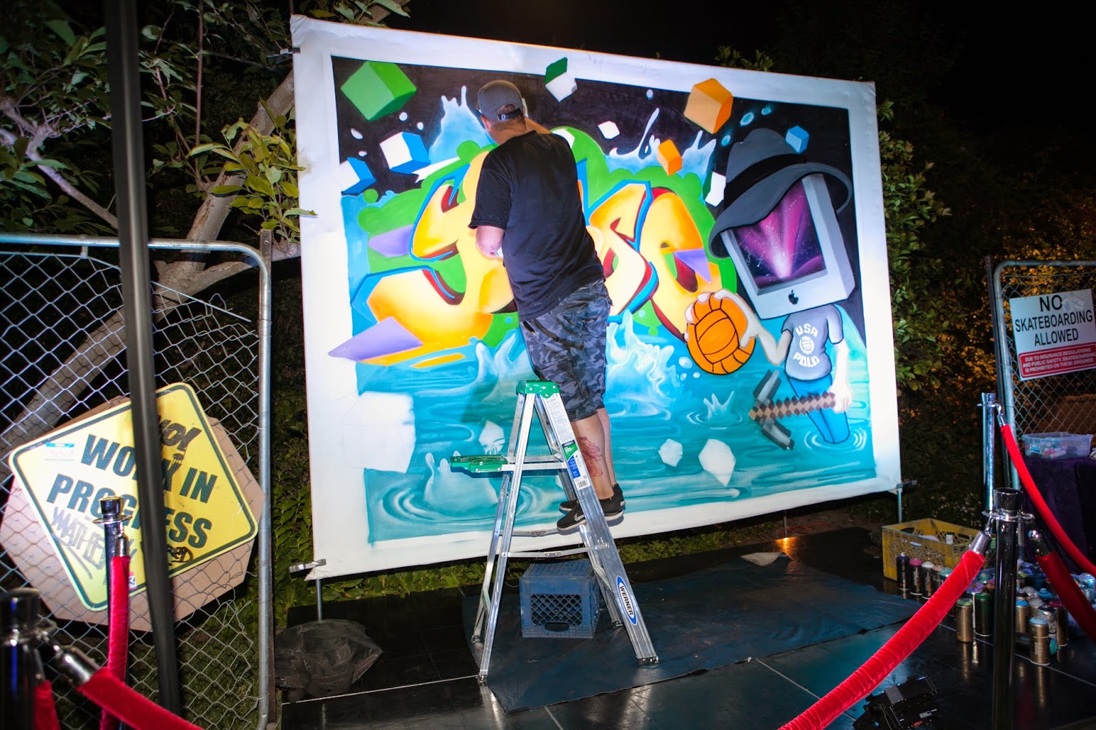 You would have been hard pressed to find an inch of this event that didn't have one street themed item on it. The various food stations were made to look like food trucks. Guests got to have custom tagged hats, license plates, and towels to take home with them. The party was decorated with tagged street signs, chain link fence, cones, and caution tape. Best of all, there were huge graffiti wall installations around the event space. The entry way had a custom made arch with Jesse's name on it. There was a "Jesse" graffiti wall in the party for guests to take photos in front of. And during the party there was a "live" graffiti artist making a custom made piece while guests watched the masterpiece unfold.