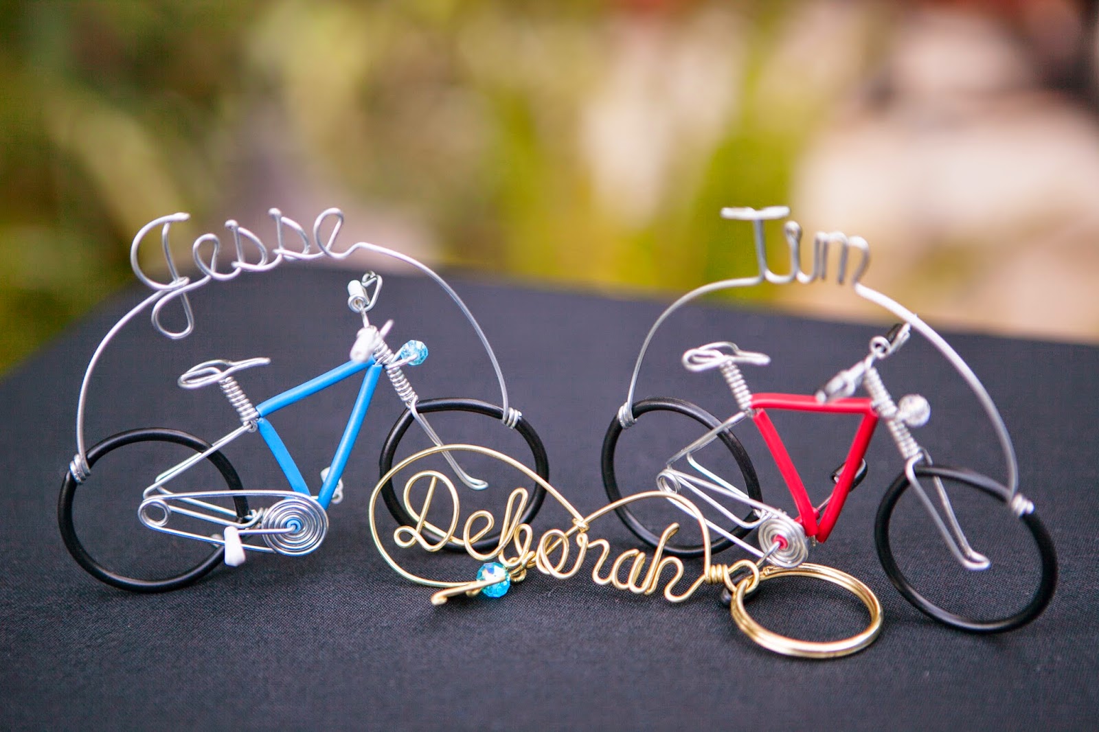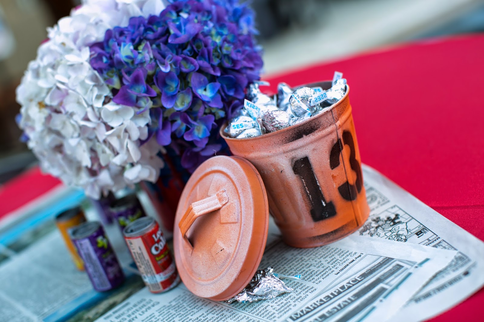 The centerpieces were tagged trash cans filled with hydrangea's from the garden. Tables had newspapers from all of Jesse's old birthdays. Deborah found mini trash cans to use for favors. She filled them with Jesse's favorite candy and then had a tagging artist do unique graffiti on each trash can. The sign-in poster was a tagged poster with Jesse's picture on it. Guests were given favor bags to take home all their loot, and got to tag them themselves. There was also a wire artist making custom made name art for guests to take home.